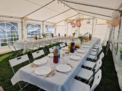 - Wysokiej jakości, czysty i solidny sprzęt (namioty, stoły, krzesła, oświetlenie, grill)